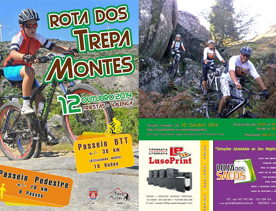 Está agendada para o dia 12 de outubro a realização em Valença da Rota dos TrepaMontes. Promovida pelo TrepaMontes - Clube BTT, a iniciativa tem o apoio da Associação de Ciclismo do Minho e integra um passeio de BTT e um passeio pedestre.